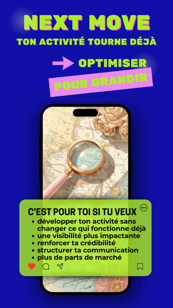 La communication sert à être visible, cohérent et mémorable, sans s’épuiser. Elle te permet de transmettre ton message avec impact, constance et clarté, pour que chaque prise de parole renforce ton image et attire naturellement les bons clients. Elle transforme ta stratégie en visibilité.